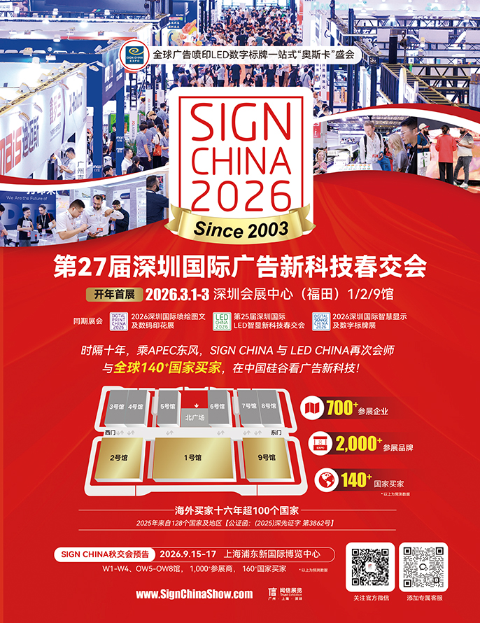 2026 年,SIGN CHINA 将延续 “春秋双展” 战略布局 ——3月于深圳会展中心(福田)启幕,9 月在上海新国际博览中心(浦东)开展,打造广告科技产业极具规模与实效的春秋双季 “交易会”。 SIGN CHINA 同期举办国际 LED 显示屏及照明展(LED CHINA)、国际智慧显示及数字标牌展(DS CHINA)、国际喷绘图文及数码印花展(DP CHINA)实现 “四展联动、资源融合”,构建覆盖全产业链的一站式采购平台,助力业界精准对接优质资源,高效开拓市场新增量!