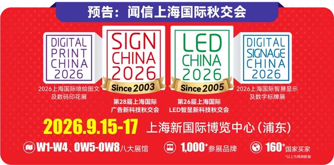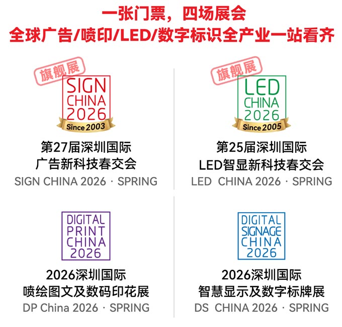 SIGN CHINA本次回归,不仅整合其独有的广告喷印LED数字标识全产业链资源,更与姐妹品牌LED CHINA第25届深圳国际LED智显新科技春交会强强联手,为您全面打开广告行业数字化升级新机遇! 无论您是寻找商文体旅、零售美陈、展览展示、商业空间前沿创意解决方案,还是采购广告标识制作设备、智慧喷印技术、创新材料板材等核心资源,都无需东奔西跑,展会现场一站式满足供需对接!